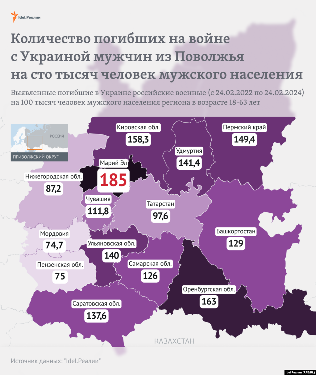 Согласно подсчетам "Idel.Реалии", с начала полномасштабного вторжения России в Украину как минимум 10 974 человека из республик и областей Поволжья погибли на войне в Украине с 24 февраля 2022 года. Их смерть так или иначе признала российская сторона.