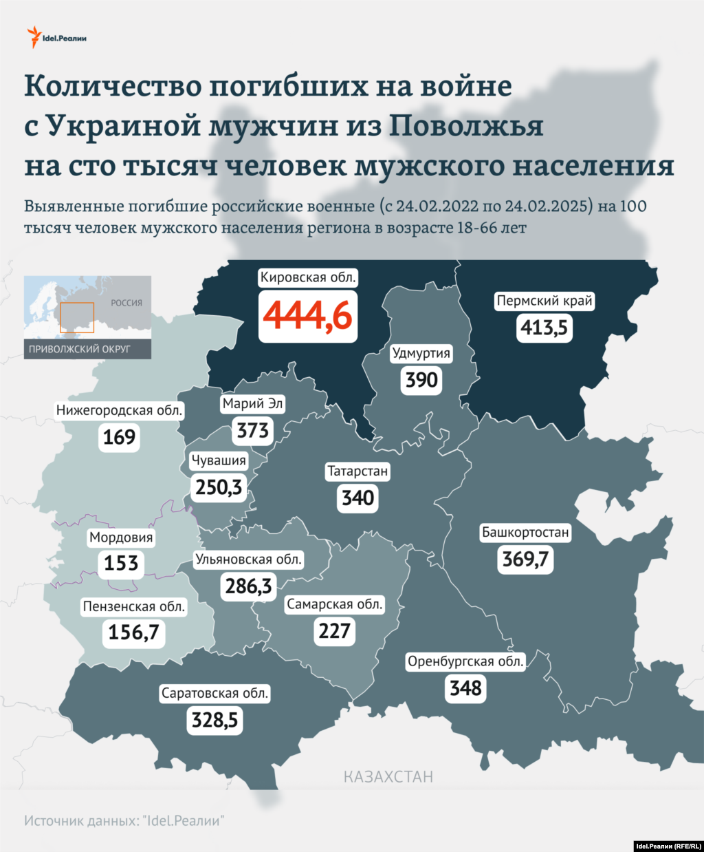 По количеству погибших мужчин на 100 тысяч мужского населения на первом месте — Кировская область с 444,6 погибшими. Следом идут Пермский край — 413,5 человека на 100 тысяч мужского населения, Удмуртия — 390 человек на 100 тысяч и Марий Эл — 373.